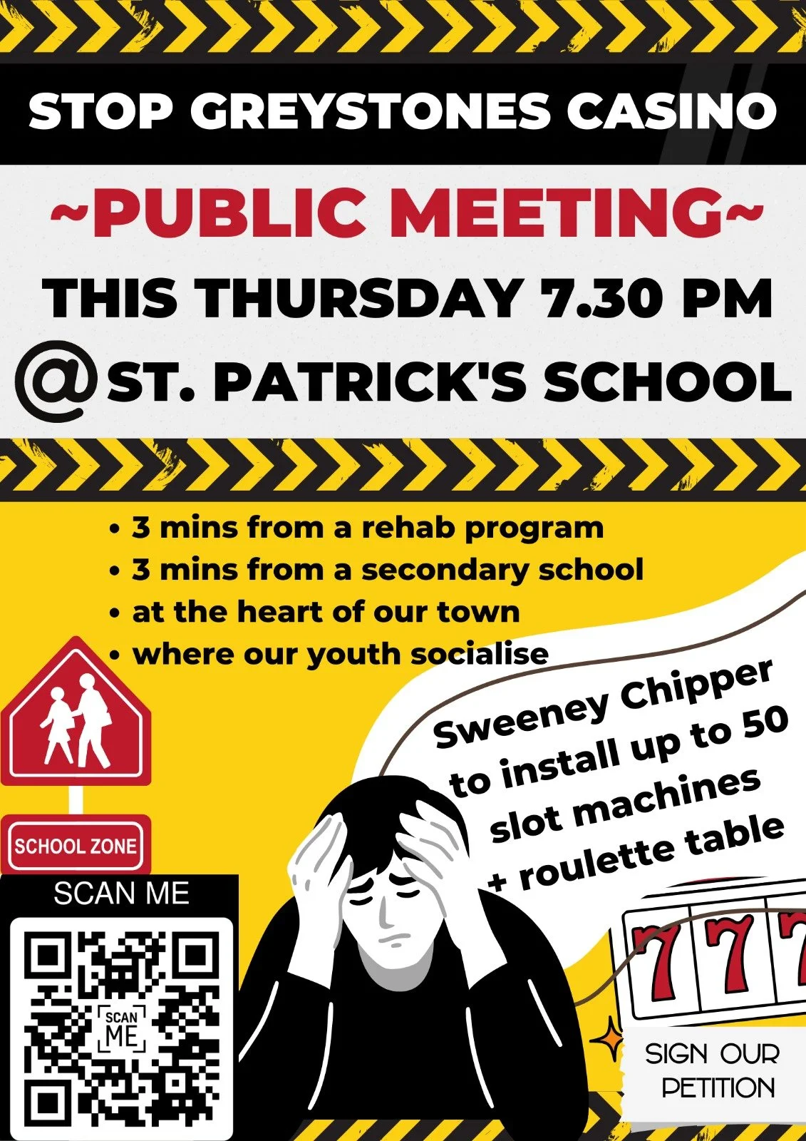 Last night, the community of Greystones gathered at St Patrick's School for an important meeting about the proposed casino in town. The attendance was overwhelming, the hall packed, and people shoulder to shoulder for space. With over 2,400 signers (and counting) on the petition against the casino, it was no surprise to see the attendance. The meeting was a testament to the community's strong stance against gambling near schools, homes, and a rehabilitation center.