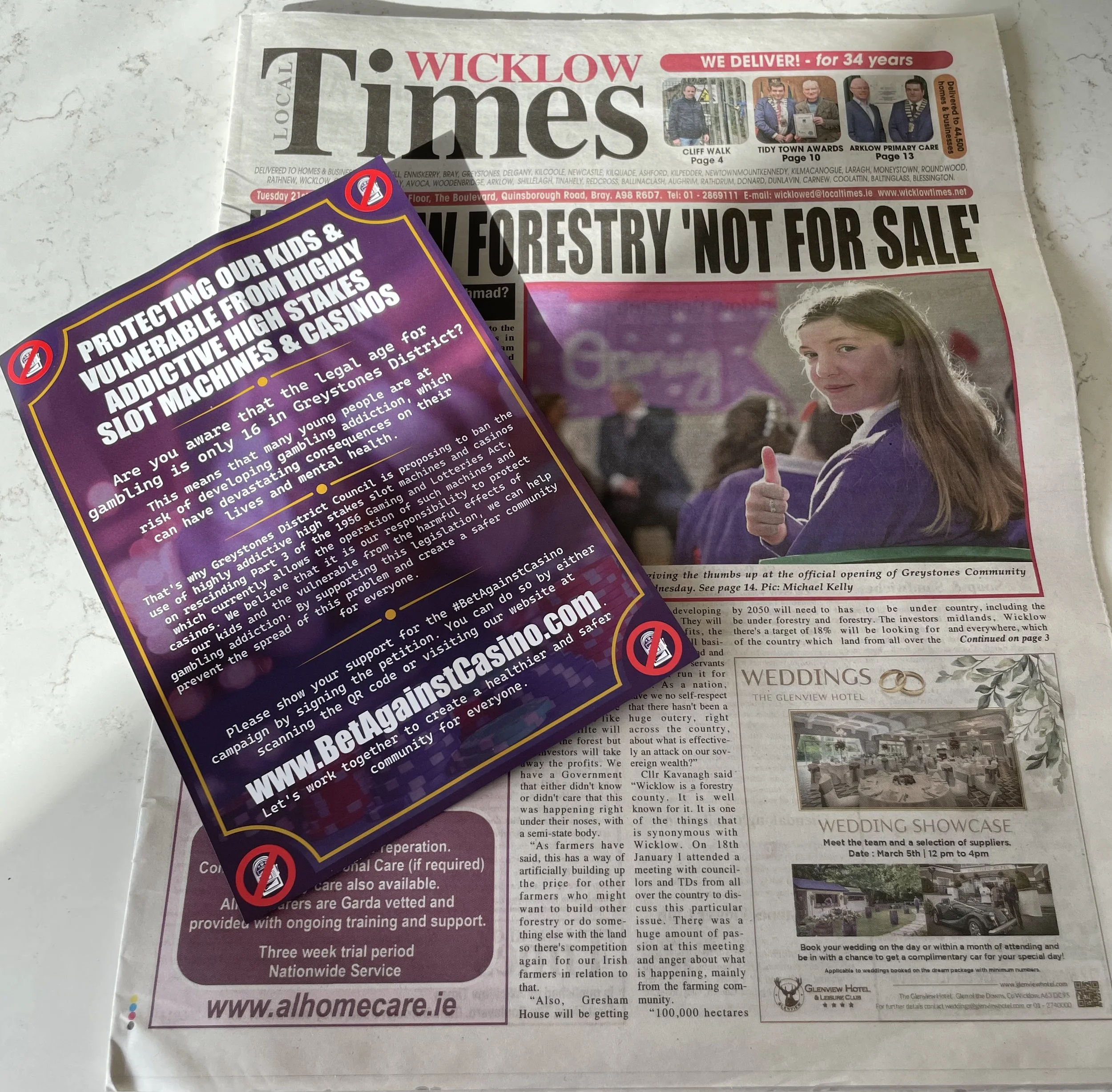 The community of Greystones is taking a stand against Slot Machines, Pokey Machines, and Casino Gambling businesses being established in their district. In a recent development, the community has delivered a leaflet to every house in the district to inform them that their elected representatives are voting to rescind the legislation that allows these businesses to take hold in the community.